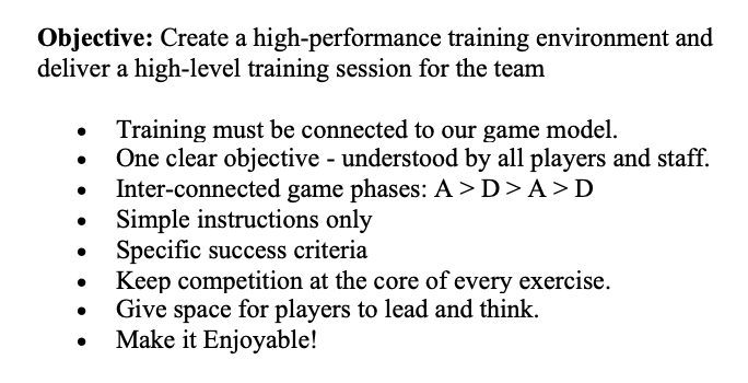 As an Assistant Coach, one of my primary roles at D.C. United and Austin FC was to prepare and deliver high-level team training sessions every day throughout the season. For many years, I had a sheet of paper pinned to my desk that I referred to as my “Gotta Get This Right List.” This list contained what I believed to be the most important aspects of creating a high-performance environment and delivering a high-level training session for the team.